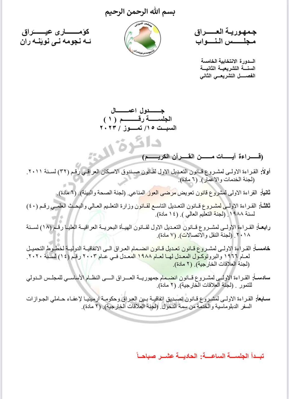أنهى مجلس النواب العراقي، القراءة الأولى على عدة مشاريع قوانين خلال جلسته الاولى من الدورة الانتخابية الخامسة السنـة التشريعية الثانية الفصـــل التشريعـــي الثاني، التي عقدت اليوم السبت 15 تموز/يوليو 2023 برئاسة رئيس المجلس محمد الحلبوسي وبحضور 178 نائباً.