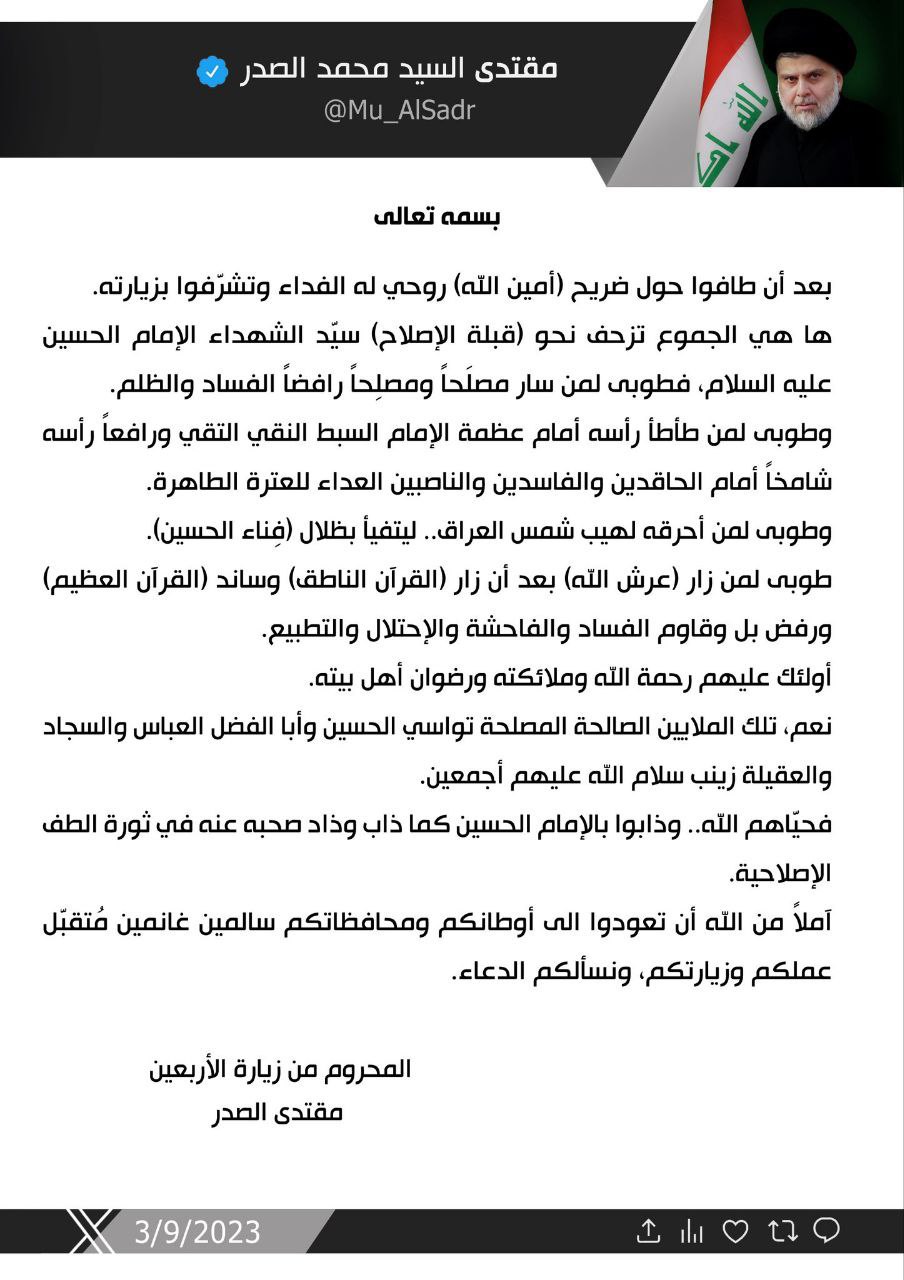 الصدر: طوبى لمن سار إلى كربلاء رافضاً للفساد