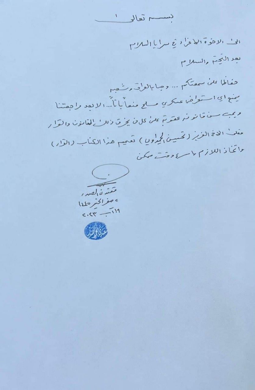 وقال الصدر في كتاب بخط يده، “الى الاخوة الأعزاء في سرايا السلام.. حفاظا على سمعتكم وحباً بالعراق وشعبه، يمنع أي استعراض عسكري مسلح منعا باتاً، الا بعد مراجعتنا”.