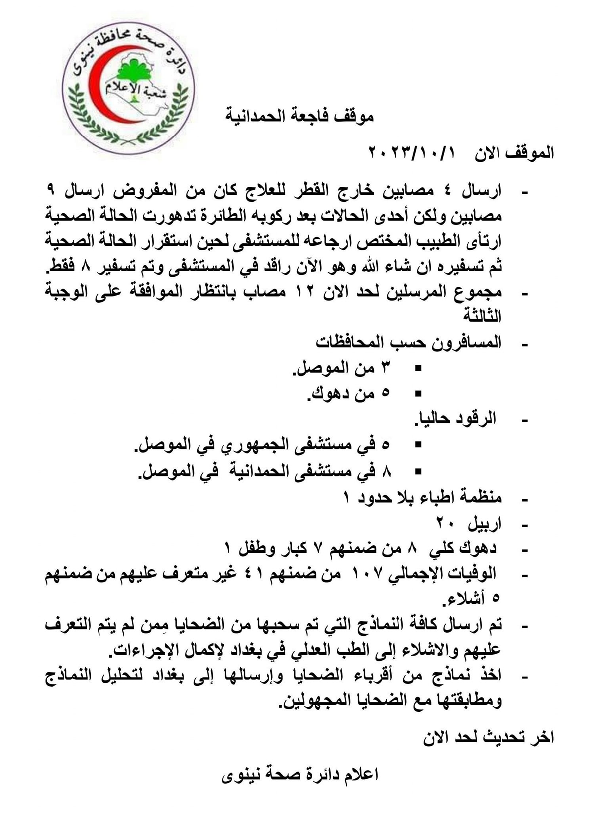 وذكرت الدائرة في بيان، ان موقف فاجعة الحمدانية كالاتي: